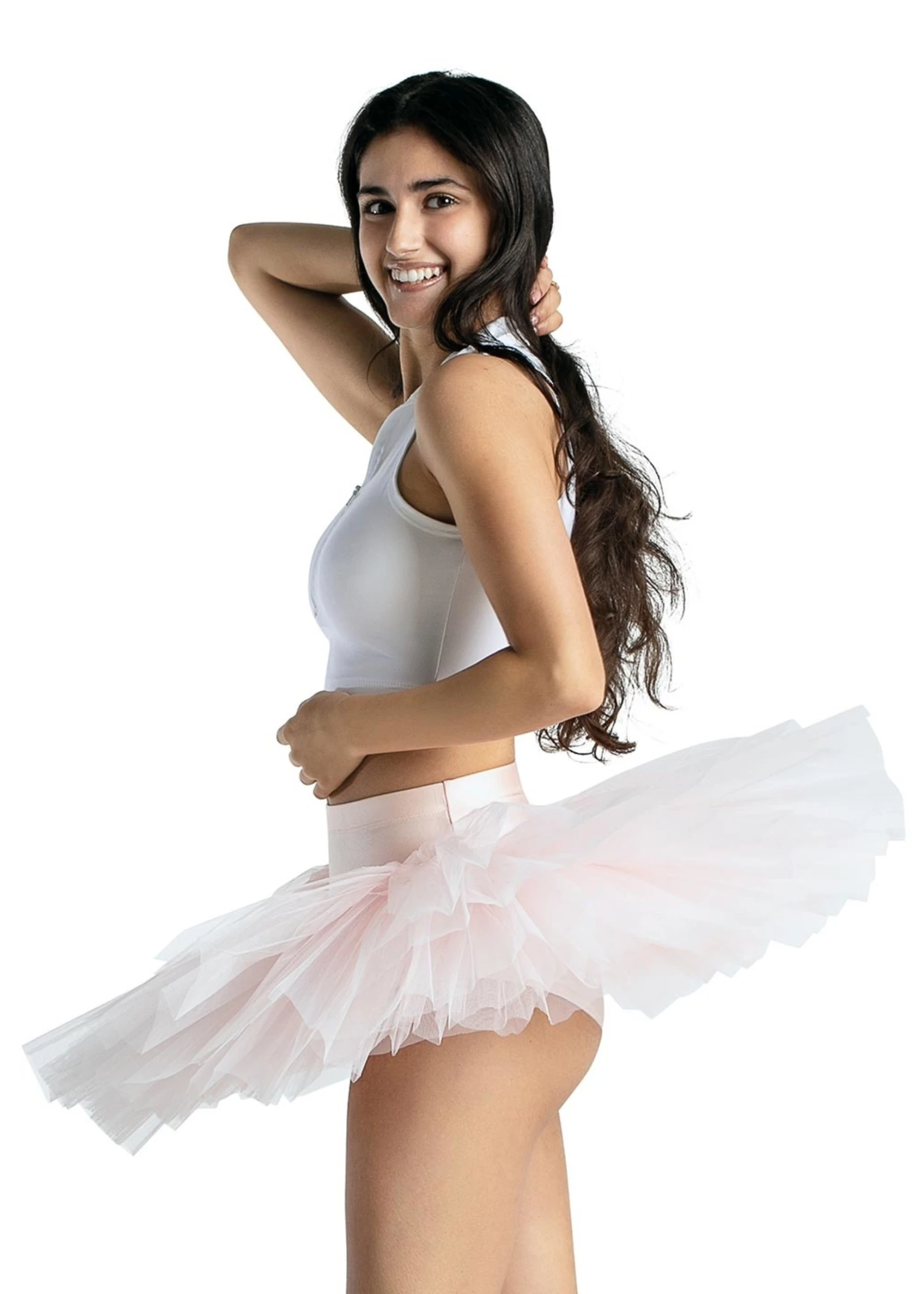 Grace the barre in the Practice Tutu. Composed of seven layer, stiff structured tulle. More features include elasticized knit waistband and a full brief for comfortable coverage. An instant staple for every pointe or ballet dancer.