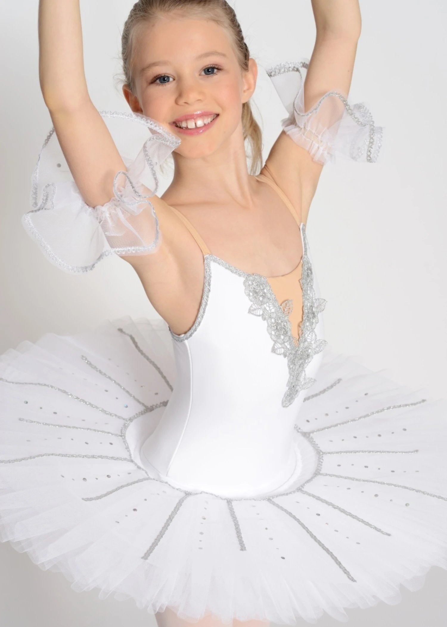 The tutu is reinforced with a light hoop making it perfect for stage or competition. Arm sleeves included.
