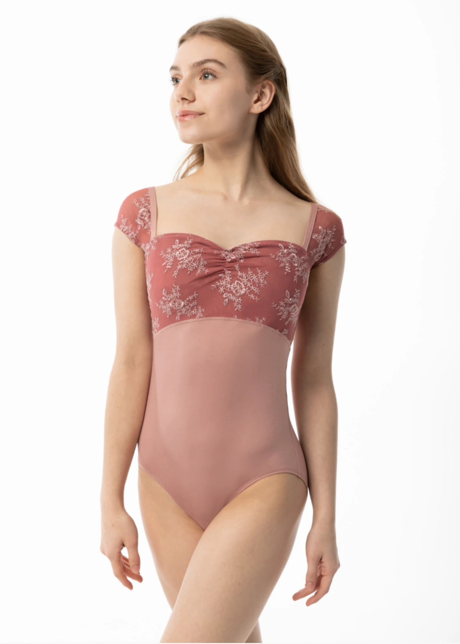 Pinch front, sweetheart neckline cap sleeve leotard with embroidered mesh overlay and keyhole back.