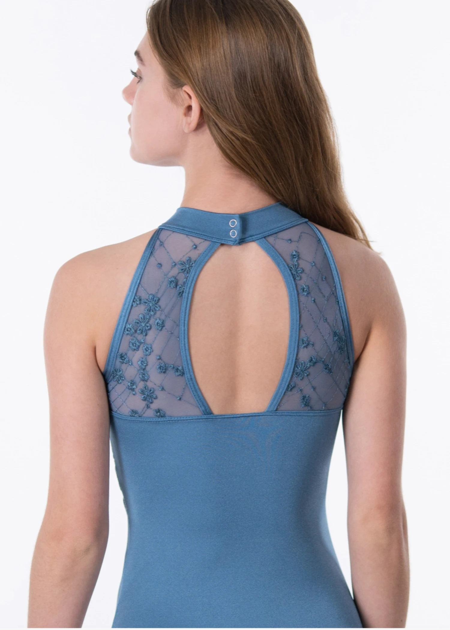 Illusion high neck leotard with embroidered mesh overlay and keyhole back. Available in black, blue and merlot.