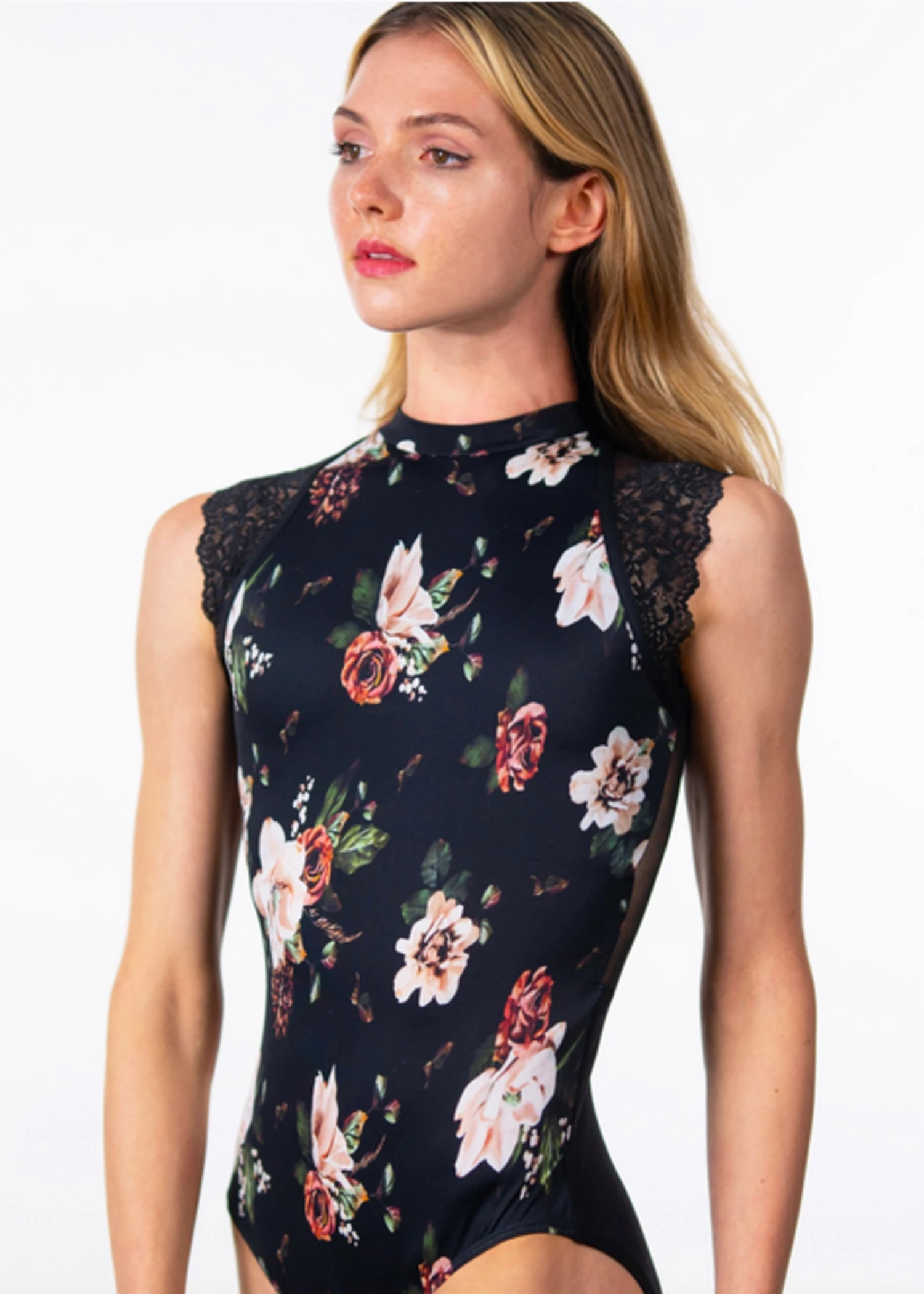 Mock neck leotard with lace cap sleeves and zip back.