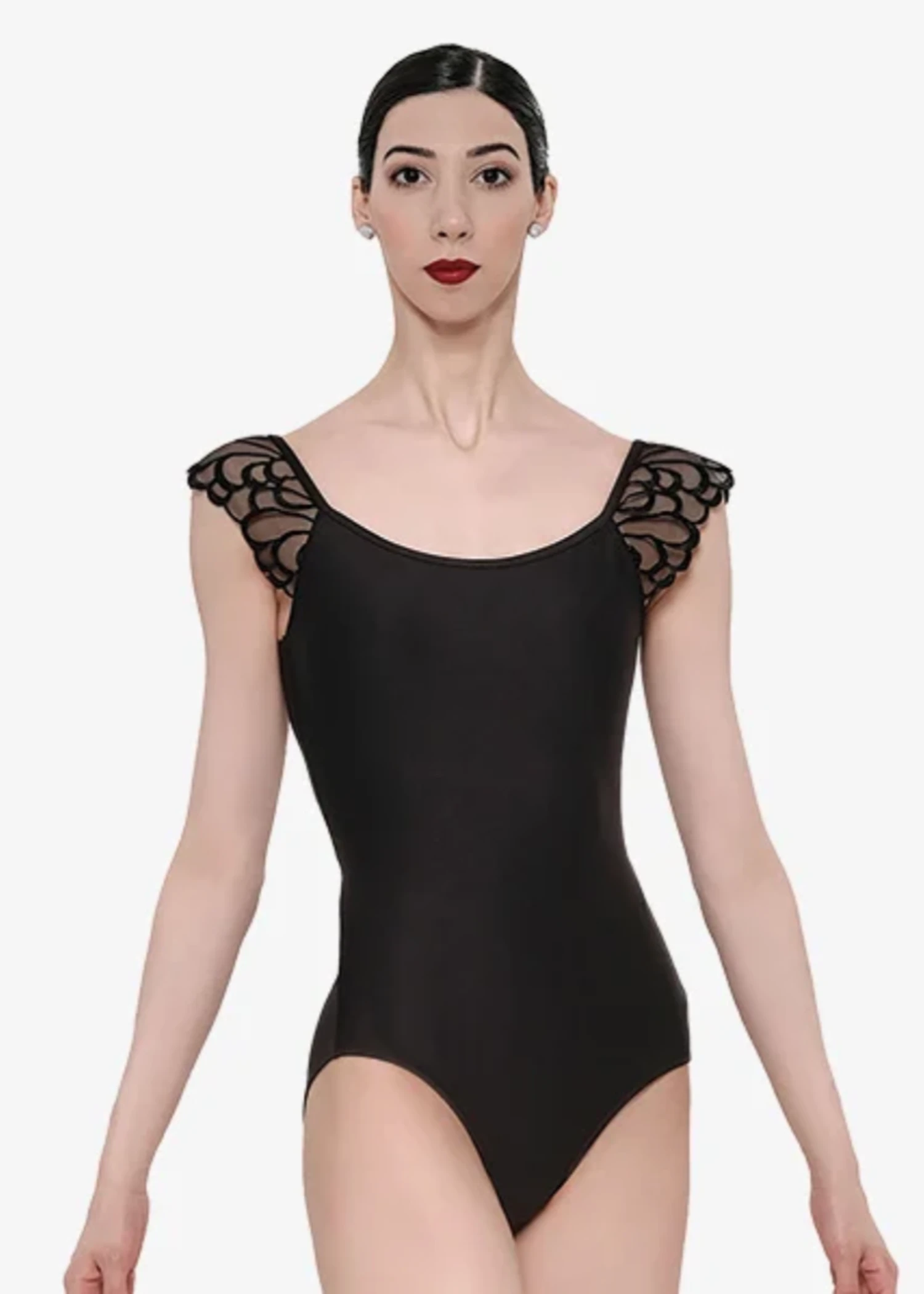 Scoop neck leotard with embroidered mesh cap sleeves. Mid back with matching mesh detail