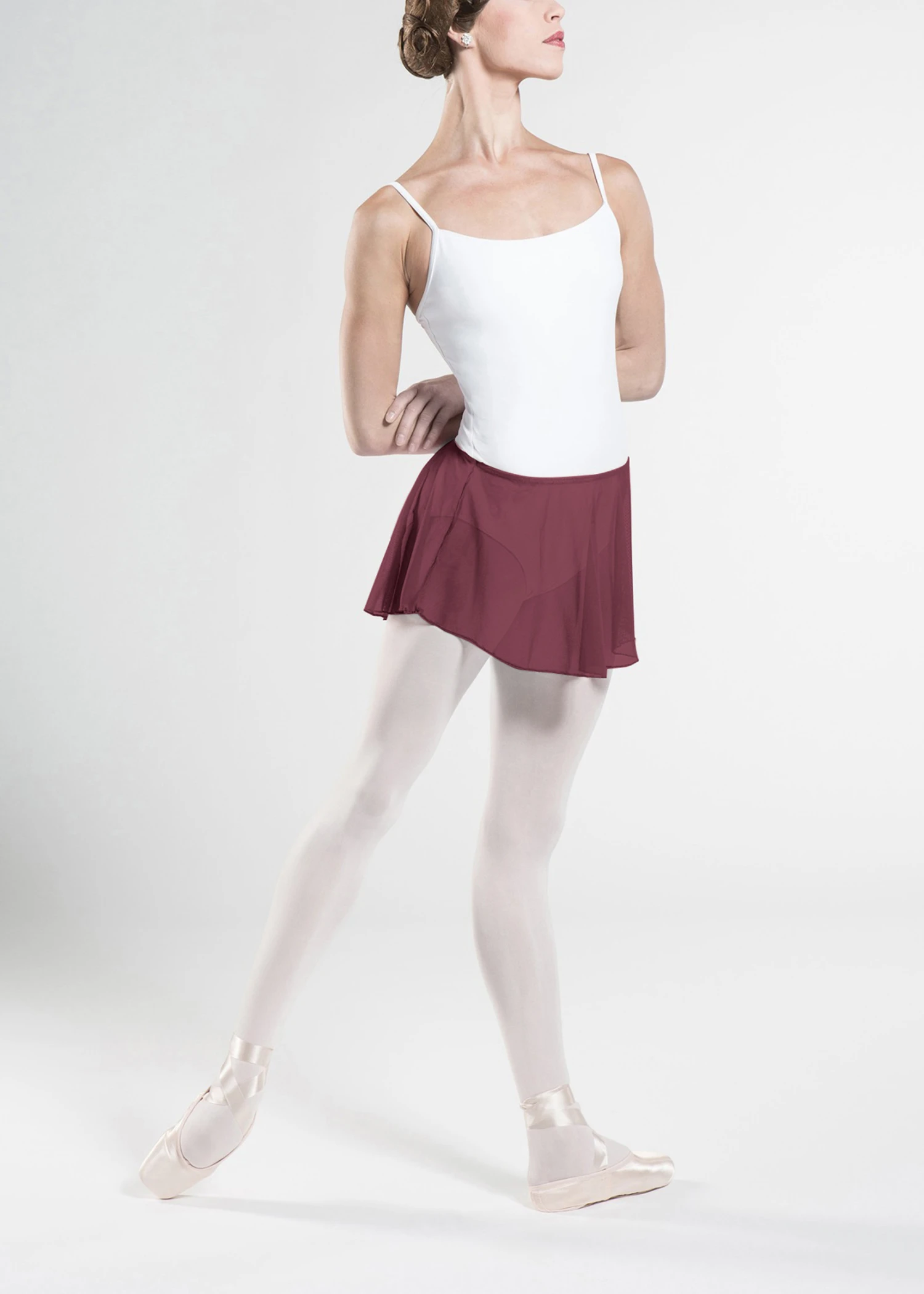 Sheer four-way stretch tulle pull-on skirt features a color-matched elastic waistband. The length of the skirt depends on the size.
